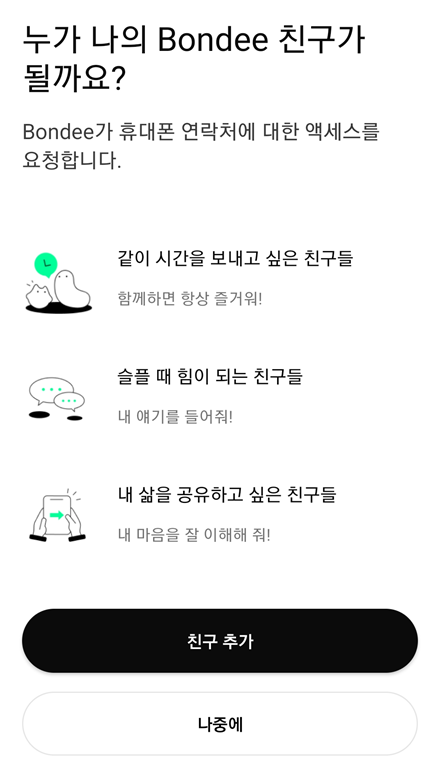같이 시간을 보내고 싶은 친구들이나, 슬플 때 힘이 되는 친구들이나, 자신의 삶을 공유하고 싶은 친구들을 선택해서 친구 추가 요청을 보내면 됩니다. 친한 친구들을 본디 Bondee로 초대해 보세요!