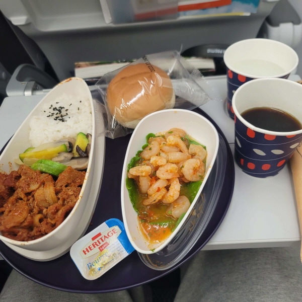 환경을 위한 그릇에 식재료를 담아서 제공되며, 생각보다 양도 많았고 적당한 간에 여태까지 먹어본 기내식 중에서 맛있었습니다. 식기가 디자인이 잘 된 느낌이어서 예뻤습니다.