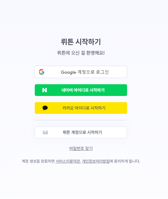 뤼튼은 구글 계정, 네이버 로그인, 카카오 아이디로 회원가입을 할 수 있으며, 다른 이메일로 직접 뤼튼 계정에 가입을 할 수 있습니다.