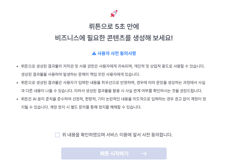 또한, 이를 통해 생성된 결과물을 사용하여 발생하는 문제의 책임 또한 사용자에게 있다는 것을 명시하고 사전 동의가 끝나면 뤼튼 서비스를 이용할 수 있습니다.