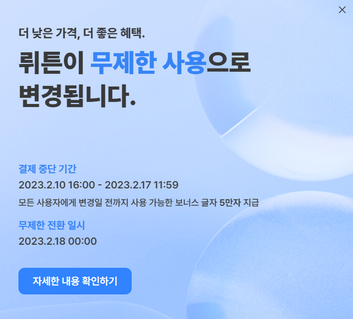 자동 카피라이팅 프로그램 뤼튼 서비스는 최신 광고 트렌드를 기반으로 AI가 학습을 통해서, 상세페이지 문구나 광고의 카피라이팅을 작성해 주는 서비스로 2022년 10월 19일에 오픈 베타 서비스를 시작했습니다.