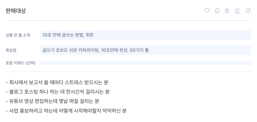 판매 대상도 알아서 정리해 주는데, 회사에서 보고서 쓸 때마다 스트레스받으시는 분, 블로그 포스팅 하나 하는데 한 시간씩 걸리시는 분, 유튜브 영상 편집하는데 몇 날 며칠 걸리는 분, 사업 홍보하려고 하는데 어떻게 시작해야 할지 막막하신 분이라고 정해줍니다.