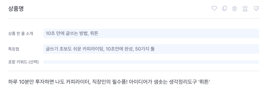 저는 상품 한 줄 소개로 '10초 만에 글 쓰는 방법, 뤼튼'이라고 쓰고 특장점으로는 글쓰기 초보도 쉬운 카피라이팅, 10초 만에 완성, 50가지 툴이라는 내용을 넣었습니다.